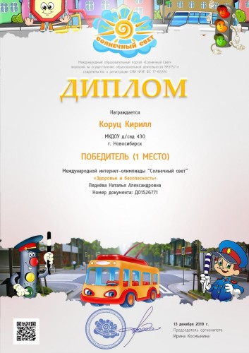 - Поздравляем Панфилову Олесю (гр. "Ромашка", педагог Карпекина Ю.О.) с дипломом победителя (1 место) Всероссийской викторины для дошкольников «Правила дорожного движения»!